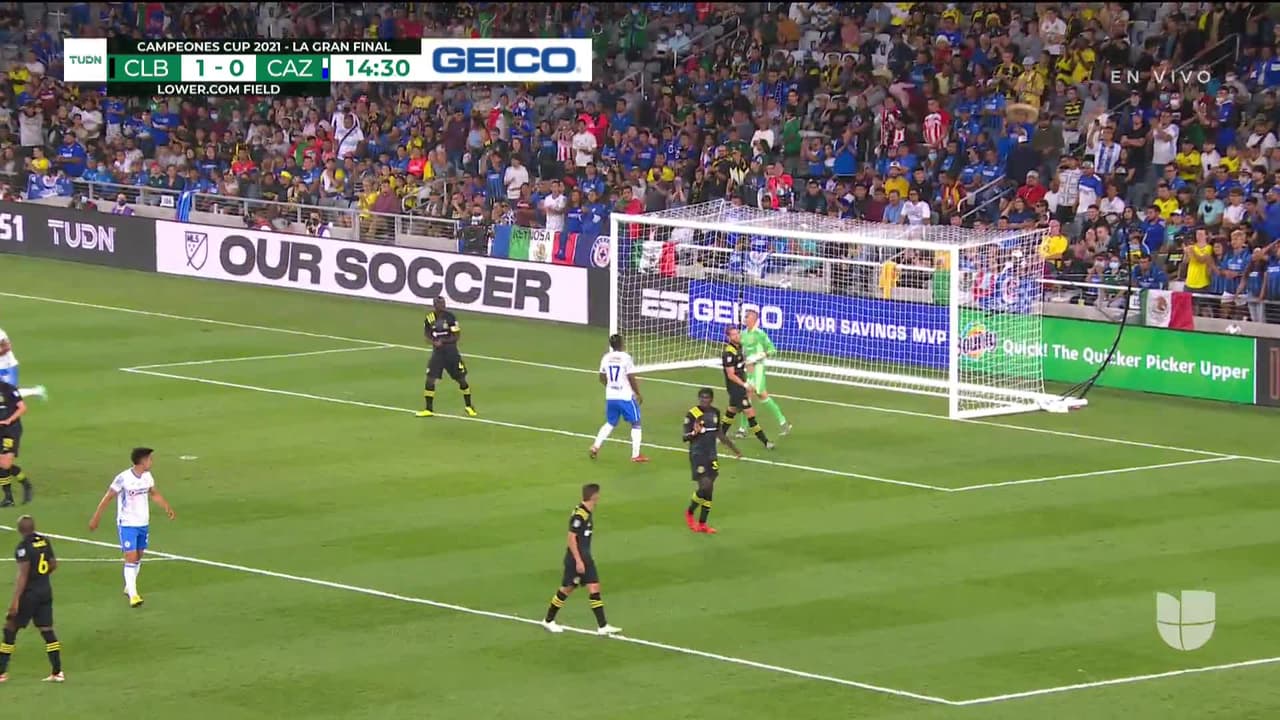 Remate parado alto y por el centro de la portería. Juan Escobar (Cruz Azul) remate con la derecha desde fuera del área. Asistencia de Guillermo Fernández.