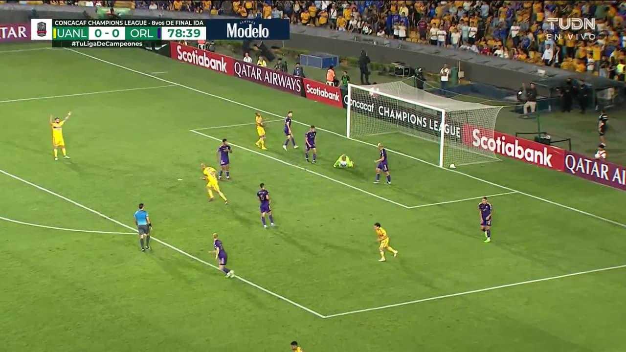 Tiro atajado junto al lado derecho de la portería. Sebastián Córdova (Tigres) zurdazo desde fuera del área. Asistencia de Diego Lainez.