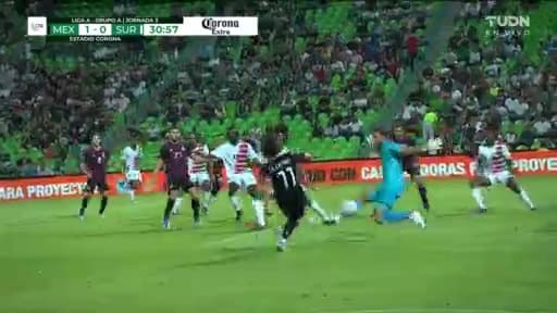 Henry Martín prolonga la jugada y le queda al atacante pero se tardo en la definición, al 31'.