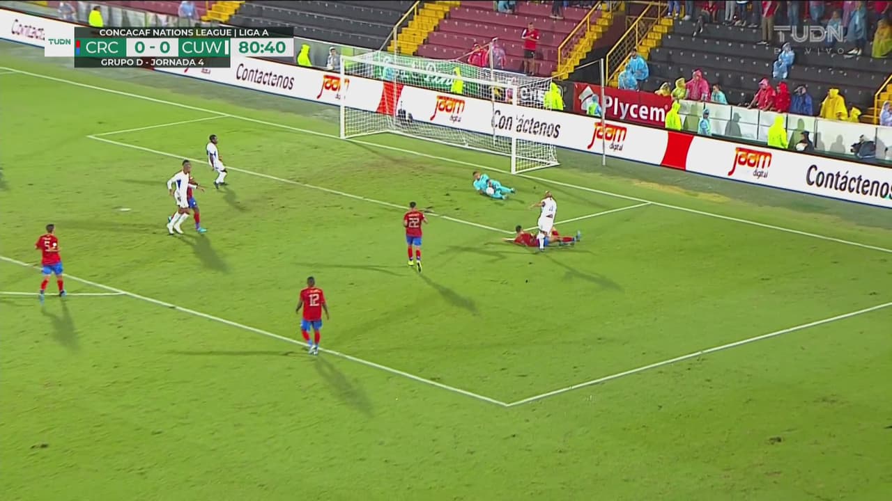 El portero de Costa Rica sigue siendo la figura, ahora atajando este remate del extremo de Curazao.
