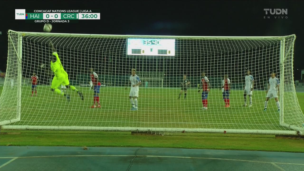 Joel Campbell dispara de zurda y el arquero haitiano se luce para evitar el gol de los ticos.
