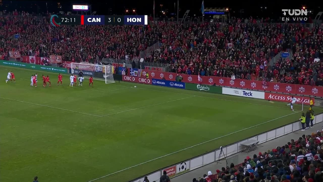 ¡Gooooool! Canada 3, Honduras 1. Jorge Benguché (Honduras) remate de cabeza desde el centro del área por bajo, junto al palo izquierdo. Asistencia de Joseph Rosales con un centro al área tras un saque de esquina.