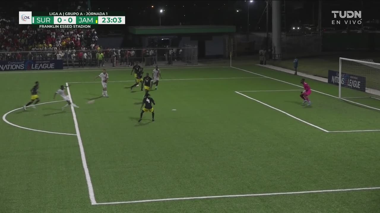 Balón largo por el costado izquierdo y el defensor dispara con furia para mandarla a la calle, al 23'.