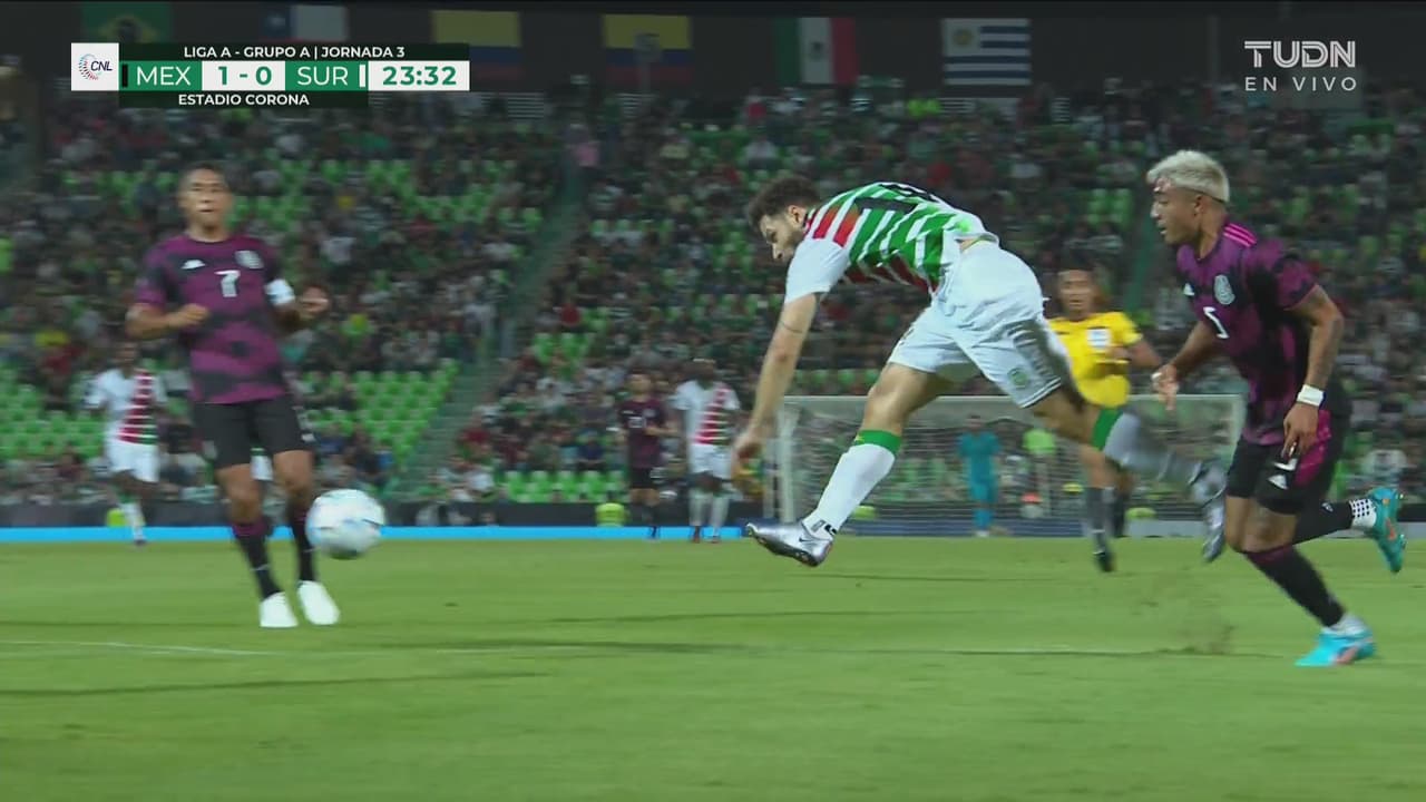 Le mandaron un pelotazo al atacante y se perfiló para disparar, pero le da al césped, al minuto 23.