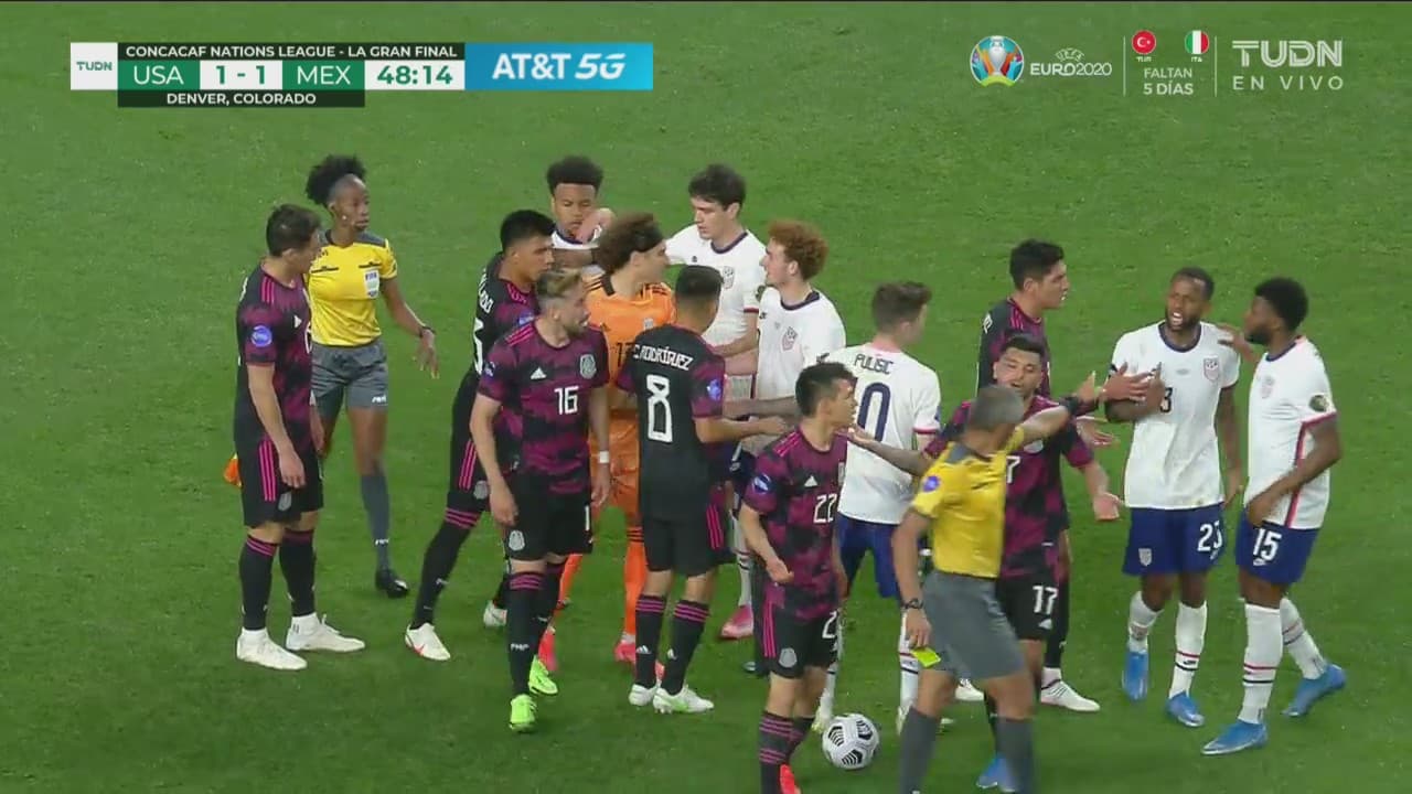 Kellyn le dejó ir la pierna a ‘HH’, lo que originó que varios jugadores de ambos equipos se encararan.