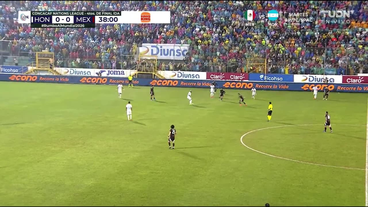 Remate parado bajo palos a rás de suelo. César Montes (México) remate de cabeza desde el centro del área. Asistencia de Orbelín Pineda.