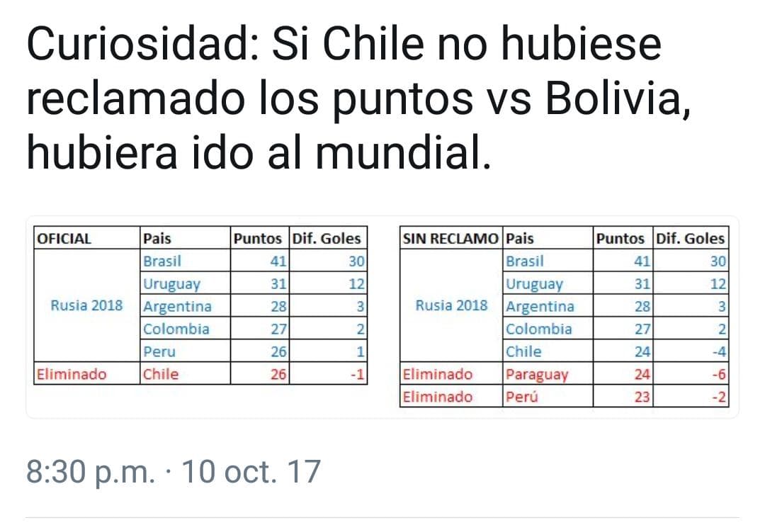 Chile se quedó por fuera del Mundial de Rusia 2018 por haber reclamado los tres puntos en el partido que había igualado 2-2 en casa ante Bolivia. Aunque no parezca cierto, el dato es verídico, pues además de los chilenos, esa decisión benefició a Perú, conjunto que perdió en su vista a La Paz por 2-0.
