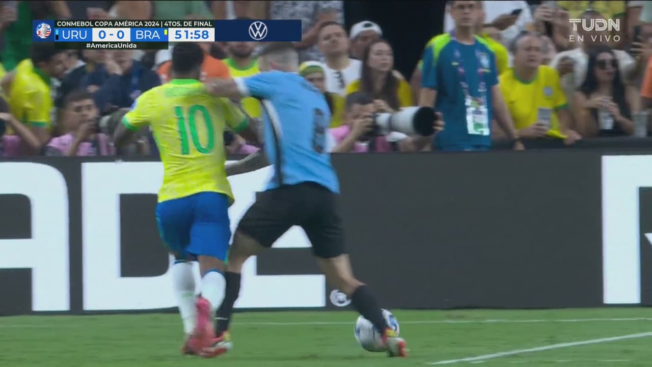 Joao Gomes dejó los tachones sobre el pie del uruguayo y lo derribó. El árbitro argentino Darío Herrera no quiere mostrar aún las tarjetas amarillas en esta semifinal entre Uurguay y Brasil de la Copa América 2024.