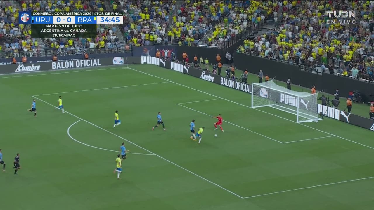 Raphinha cobró tiro libre directo al 13', pero la zaga desvió a tiro de esquina para ocnservar el 0-0 entre Uruguay y Brasil en los Cuartos de Final de la Copa América 2024.