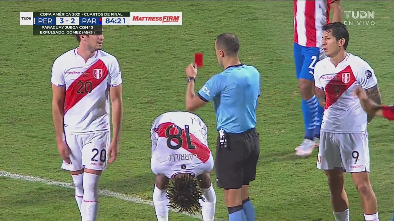 Uno de los mejores jugadores de Perú ve la segunda tarjeta amarilla y la roja por falta en la mitad del campo al 84'.
