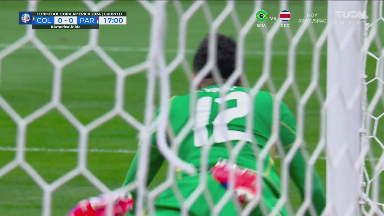 El paraguayo cobró directo al arco el tiro libre, pero Camilo llegó perfecto para tapar.