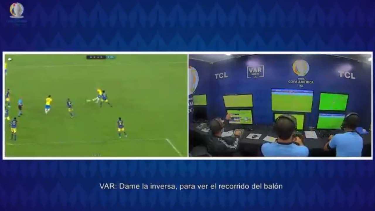 El jugador brasileño "juega lateralmente no construyendo un ataque prometedor, el árbitro permite que el juego continúe tomando una decisión que se ajusta a las reglas de juego ya que el balón no entra directamente en portería, no cambia de posesión y no inicia un ataque prometedor que son las tres acciones por las cuales se debería detener el juego y reanudar con un bote a tierra", explica una voz en off en la reproducción.