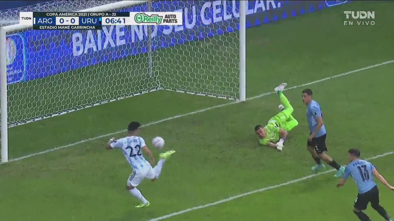 El portero de Uruguay desvió el tiro de Leo y el esférico le quedó a Martínez, pero no marcó al 6’.