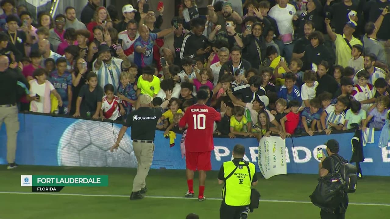 El brasileño le regaló su playera a un aficionado y casi acaba en accidente con una valla publicitaria; pese a ello el público se le entregó.