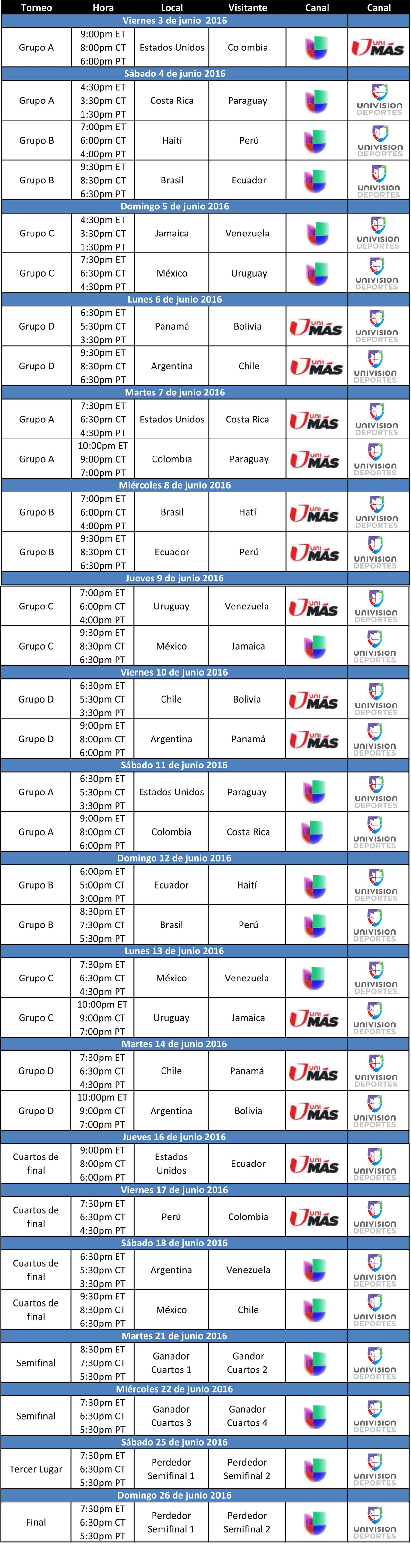 ¿Deseas ver todos los partidos de la Copa América Centenario 2016? Univisión Deportes creó para ti esta tabla con toda la información de cada uno de los partidos, los grupos a los que pertenecen, los horarios y el canal que desees escoger. Disfruta y déjate contagiar de toda la emoción de los partidos de la Copa América Centenario 2016.