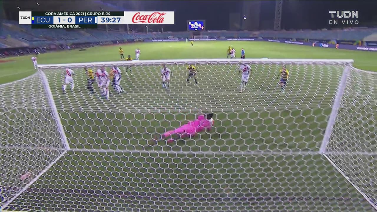 El delantero de la selección ecuatoriana sacó un remate que se fue por encima del arco de Perú.