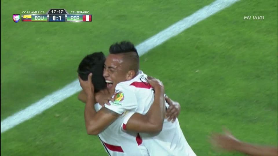 La primera llegada la tuvo Perú apenas a los 51 segundos de juego, disparo de Paolo Guerrero que el portero ecuatoriano Alexander Domínguez desvió. Apenas 4 minutos después Christian Cueva hace una jugada “mágica”. Se acomodó pisando el balón que pasa entre las piernas del defensa y define con disparo certero para el 1 – 0.