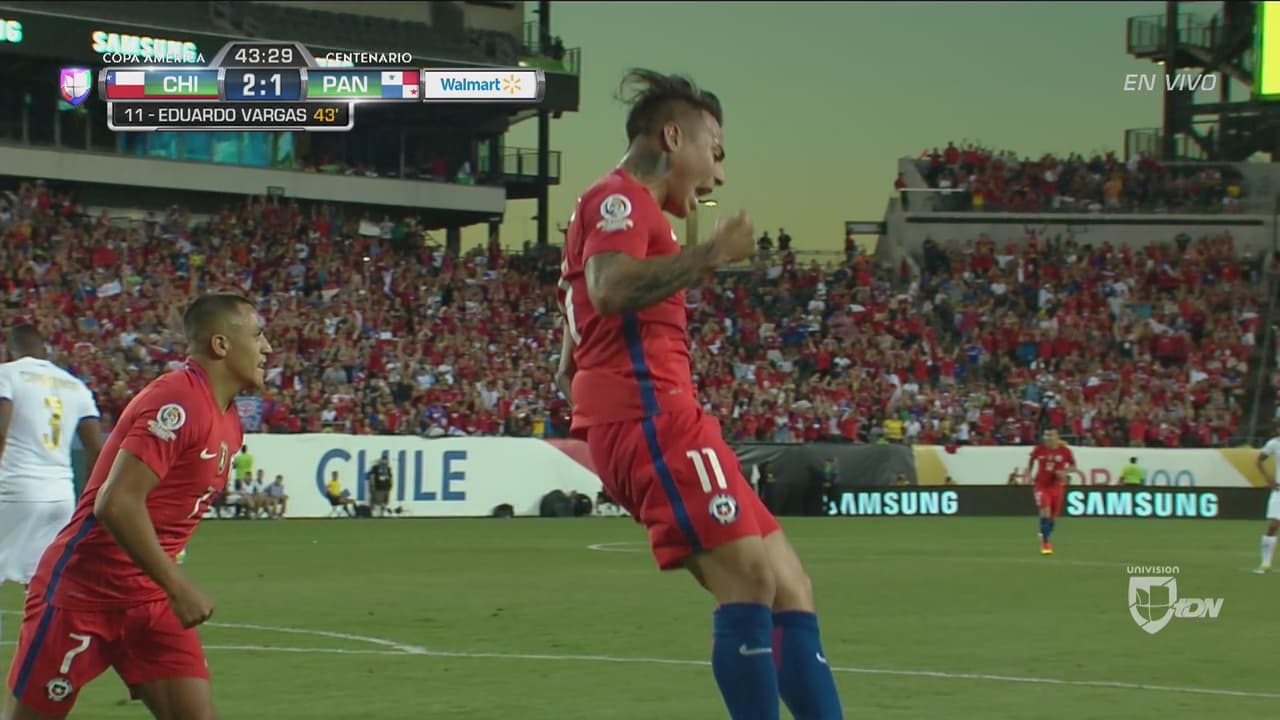Golzao de cabeza de Eduardo Vargas contra Panamá para poner en ventaja a Chile 2-1 en el primer tiempo.