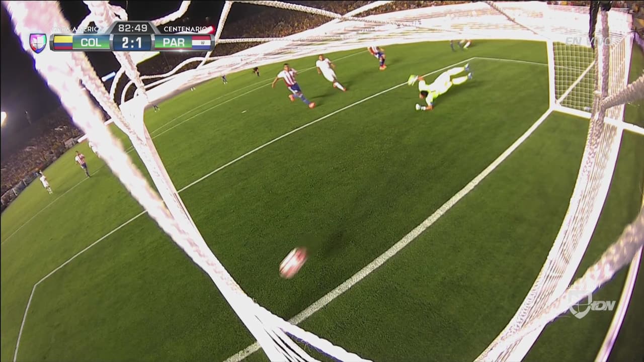 ¡Zapatazo de Arias que pega en la zaga y el Dibu recoge el rebote!