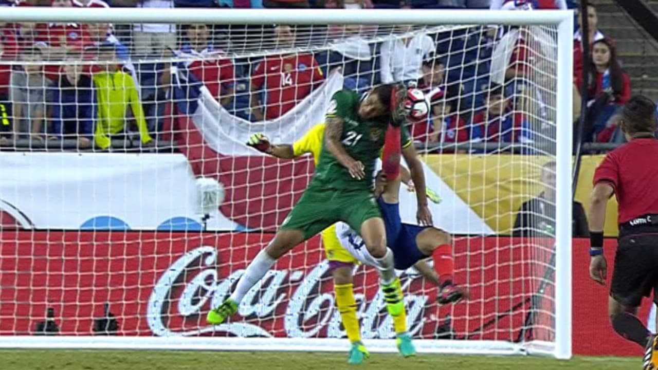 El defensa boliviano Eguino recibió una fuerte patada en la cabeza cuando el chileno Vargas intentaba una hacer una chilena en ataque