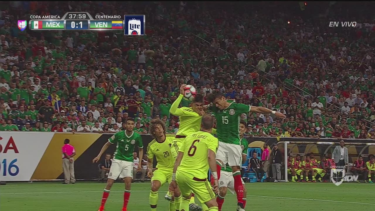 Wilker Ángel y Héctor Moreno saltaron en el tiro de esquina. La pelota pegó en la mano del venezolano, pero el juez la consideró involuntaria.