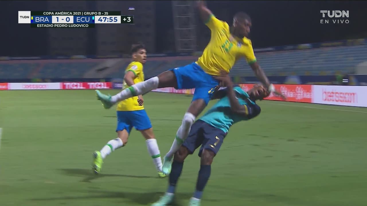 El jugador de Brasil anticipó en una jugada por aire, pero en el vuelo alcanzó a golpear al de Ecuador.