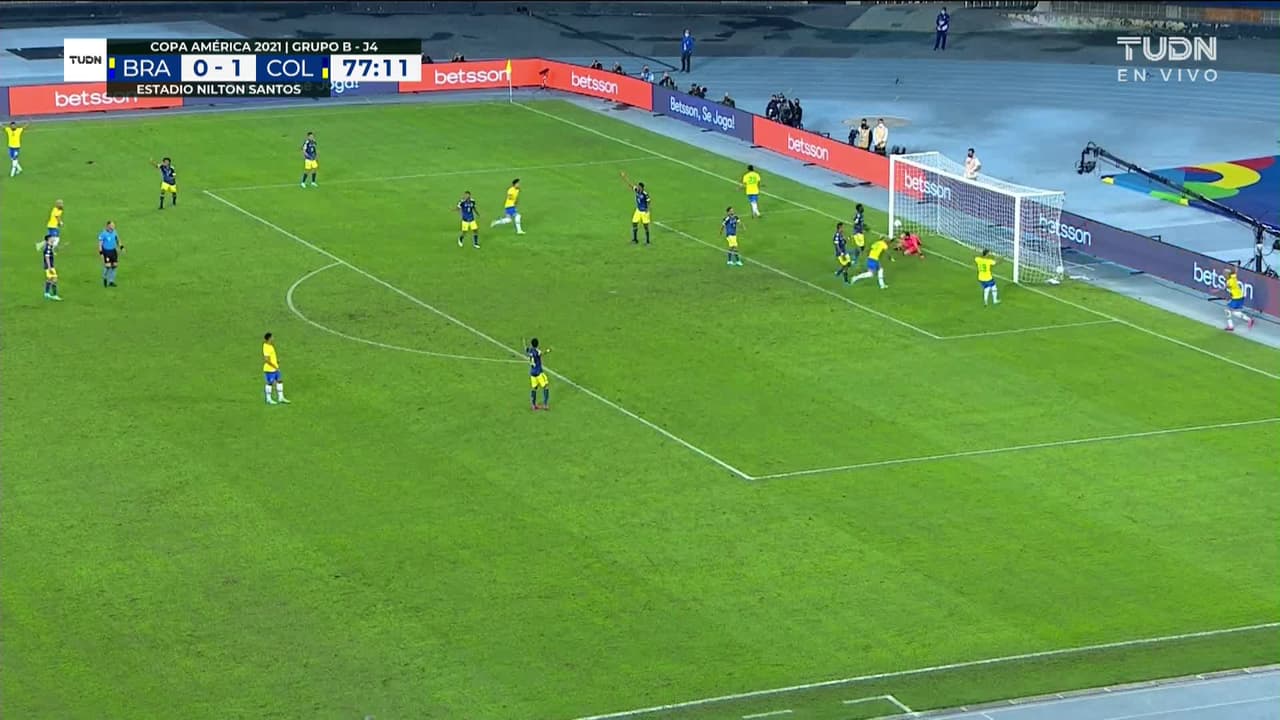 ¡Gol! Brasil 1| Colombia 1. Roberto Firmino (Brasil) disparo de cabeza desde el centro del área al centro de la portería. Asistencia de Renan Lodi con un centro al área.