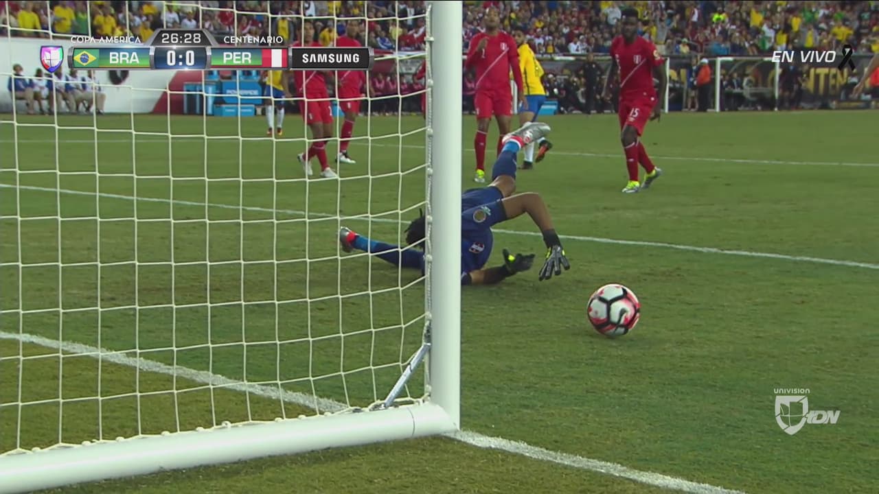El disparo del brasileño iba muy pegado a la base del palo derecho, pero hasta allá llegó la mano salvadora del portero peruano.