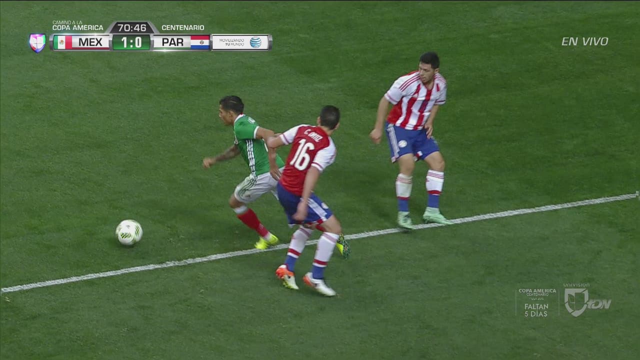 El jugador mexicano enseña su habilidad ante la defensa paraguaya, pero finaliza mal la jugada.