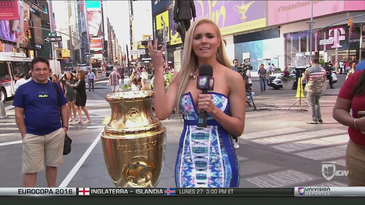 Mira a la gente hablando e interactuando con el trofeo que se llevará el campeón de la Copa América Centenario.