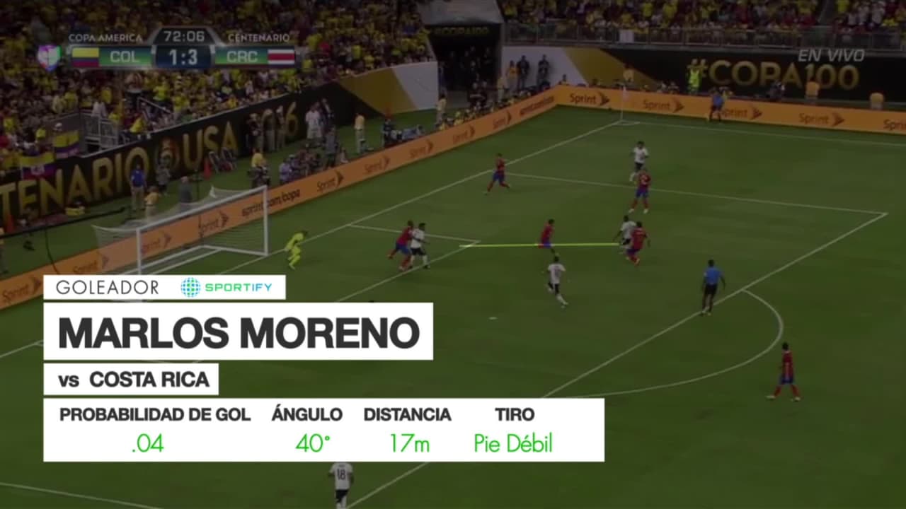 Las estadísticas del gol de Marlos Moreno de Colombia ante Costa Rica.
