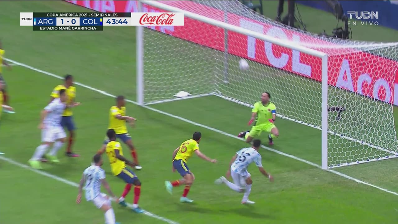 Poco a poco Colombia fue metiendo en su campo a Argentina y fue al minuto 35 cuando vino el gran embate cafetero que, literal, cimbró la cabaña defendida por Emiliano Martínez.