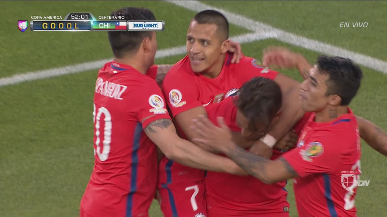 Chile la toca desde el medio campo a espaldas de la defensa de México y Eduardo Vargas no perdona el 4-0.