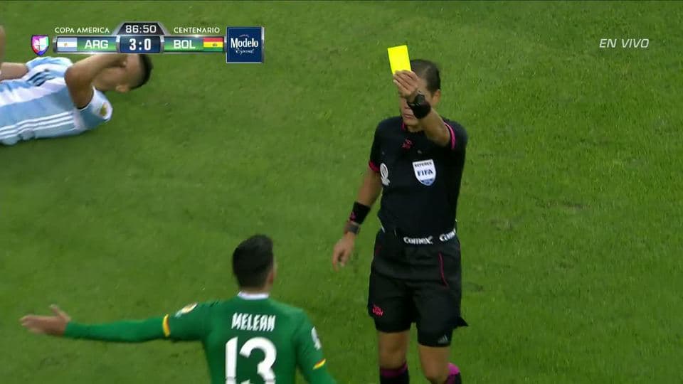 Tarjeta amarilla. El árbitro amonesta a Alejandro Meleán de Bolivia on June 14, 2016