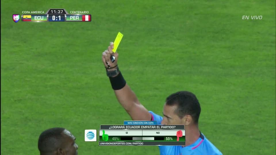 Tarjeta amarilla. El árbitro amonesta a Carlos Armando Gruezo de Ecuador