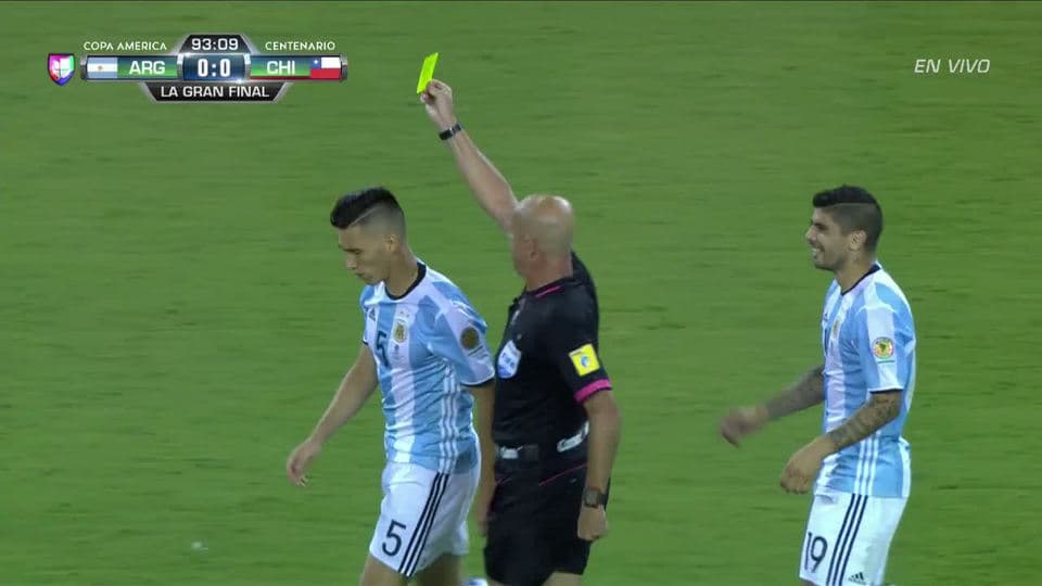 Tarjeta amarilla. El árbitro amonesta a Claudio Matías Kranevitter de Argentina
