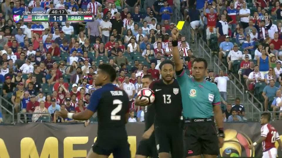 Tarjeta amarilla. El árbitro amonesta a DeAndre Yedlin de Estados Unidos