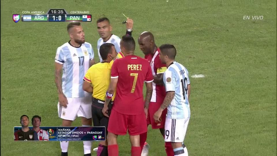 Tarjeta amarilla. El árbitro amonesta a Javier Mascherano de Argentina on June 10, 2016