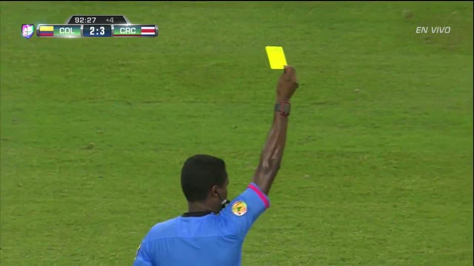 Tarjeta amarilla. El árbitro amonesta a Joel Nathaniel Campbell Samuels de Costa Rica