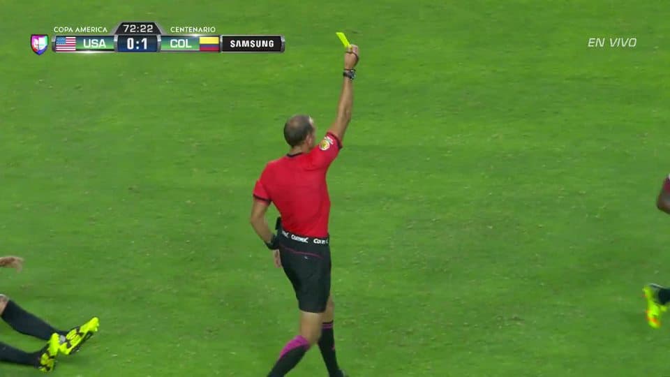 Tarjeta amarilla. El árbitro amonesta a Juan Guillermo Cuadrado Bello de Colombia on June 25, 2016