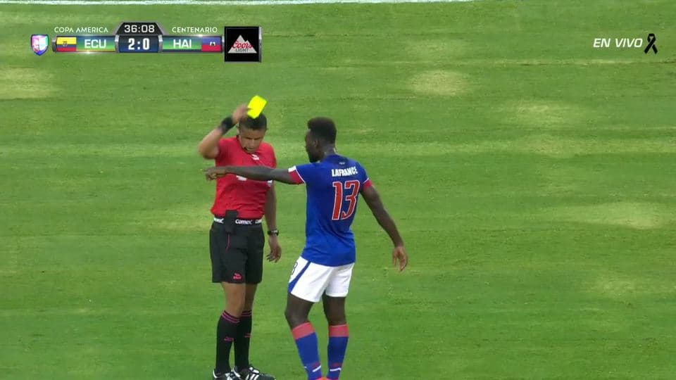 Tarjeta amarilla. El árbitro amonesta a Kevin Lafrance de Haití