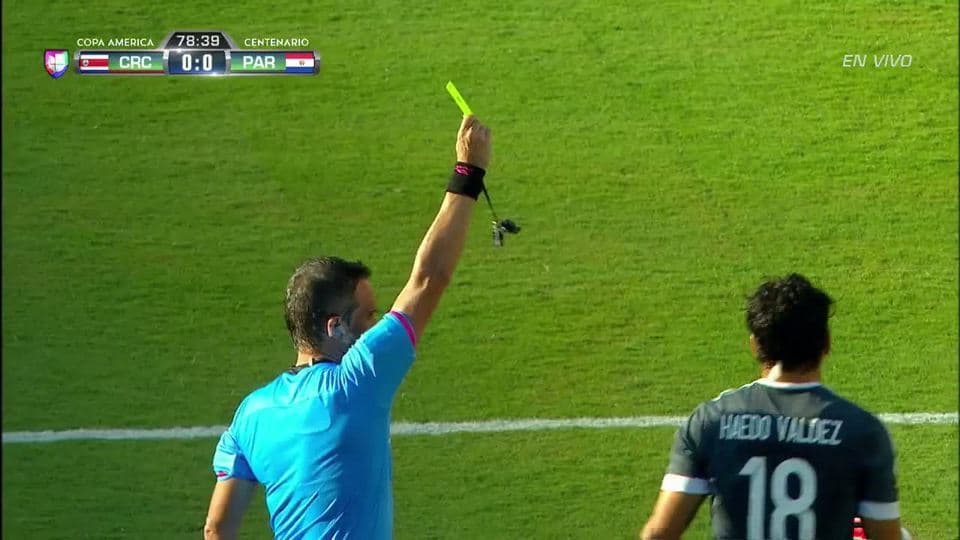 Tarjeta amarilla. El árbitro amonesta a Nelson Antonio Haedo Valdez de Paraguay