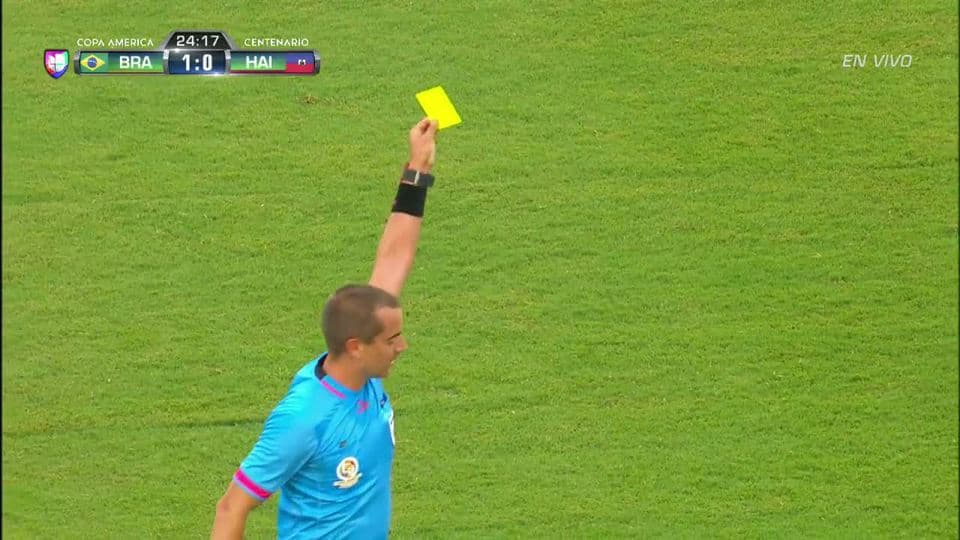 Tarjeta amarilla. El árbitro amonesta a Reginald Goreux de Haití