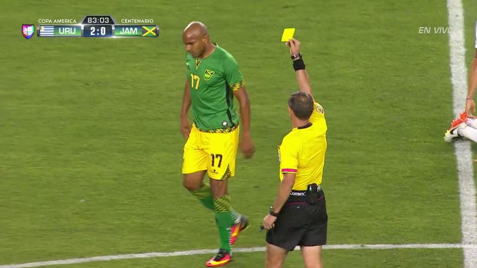 Tarjeta amarilla. El árbitro amonesta a Rodolph Austin de Jamaica on June 13, 2016