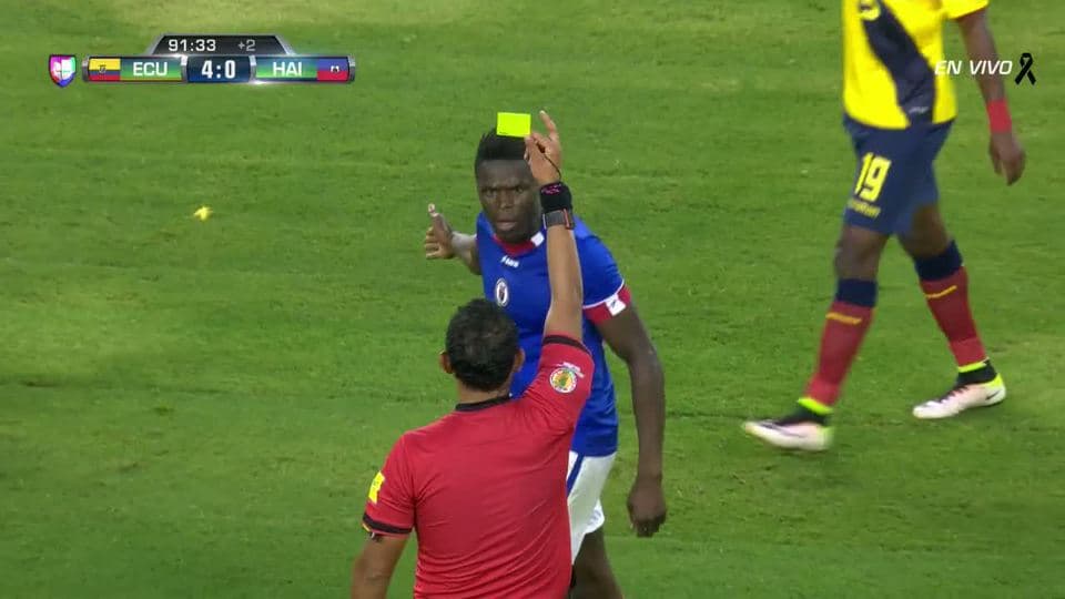 Tarjeta amarilla. El árbitro amonesta a Romain Genevois de Haití