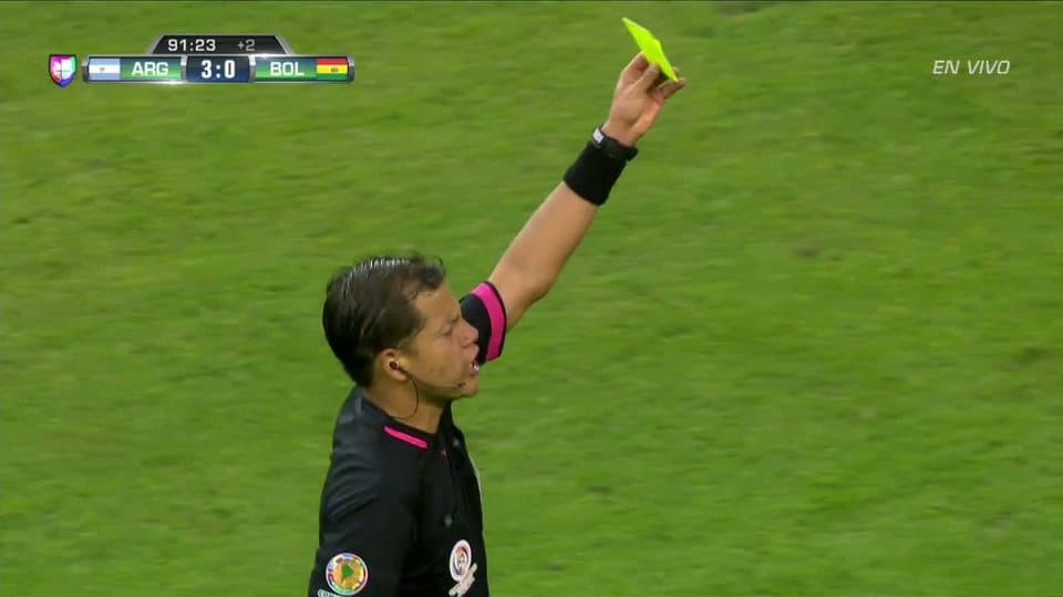 Tarjeta amarilla. El árbitro amonesta a Víctor Leandro Cuesta de Argentina