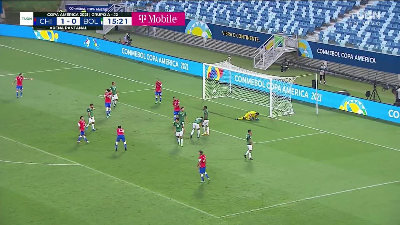 Tiro atajado al ángulo superior derecho. Erick Pulgar (Chile) Disparo con la derecha desde el centro del área. Asistencia de Jean Meneses.