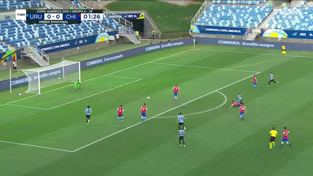 Tiro atajado raso al centro del arco. Giorgian de Arrascaeta (Uruguay) Disparo con la derecha desde fuera del área.