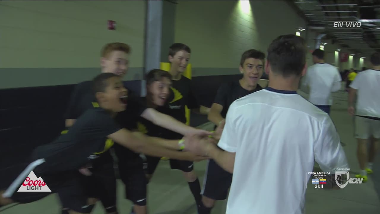Los recoge pelotas se lanzan para saludar a Messi en el túnel de vestuario antes del juego contra Venezuela.