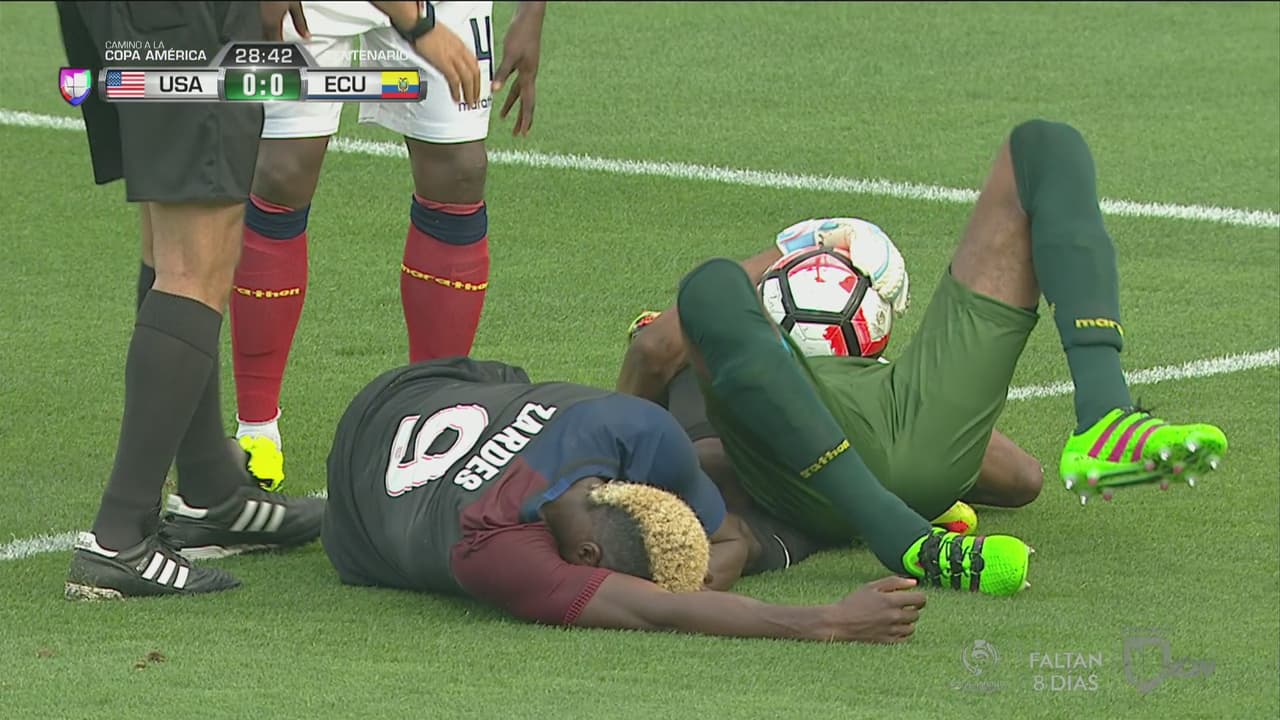El delantero estadounidense y el arquero ecuatoriano quedan en el césped tras buscar un balón uno a uno.
